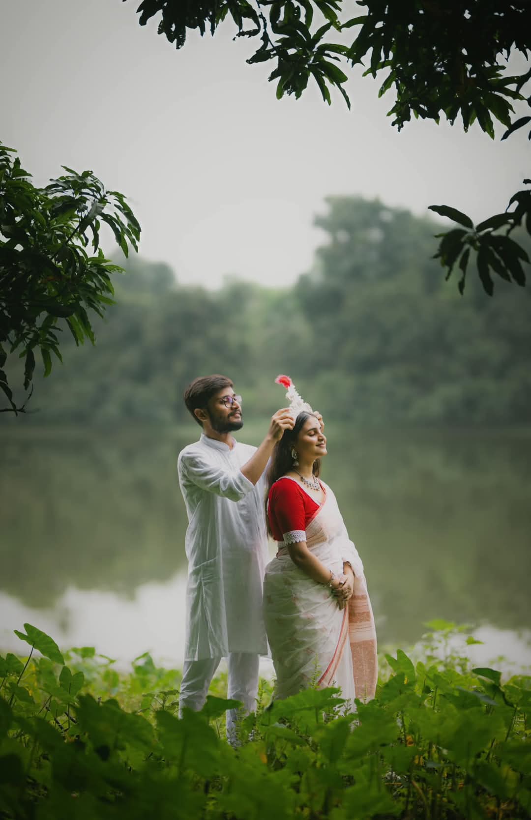 Captured in the soft embrace of nature, this intimate portrait reflects love, tradition, and tranquility. Dressed in traditional attire, the couple shares a quiet, heartfelt moment by the water’s edge — a timeless memory wrapped in warmth and serenity.